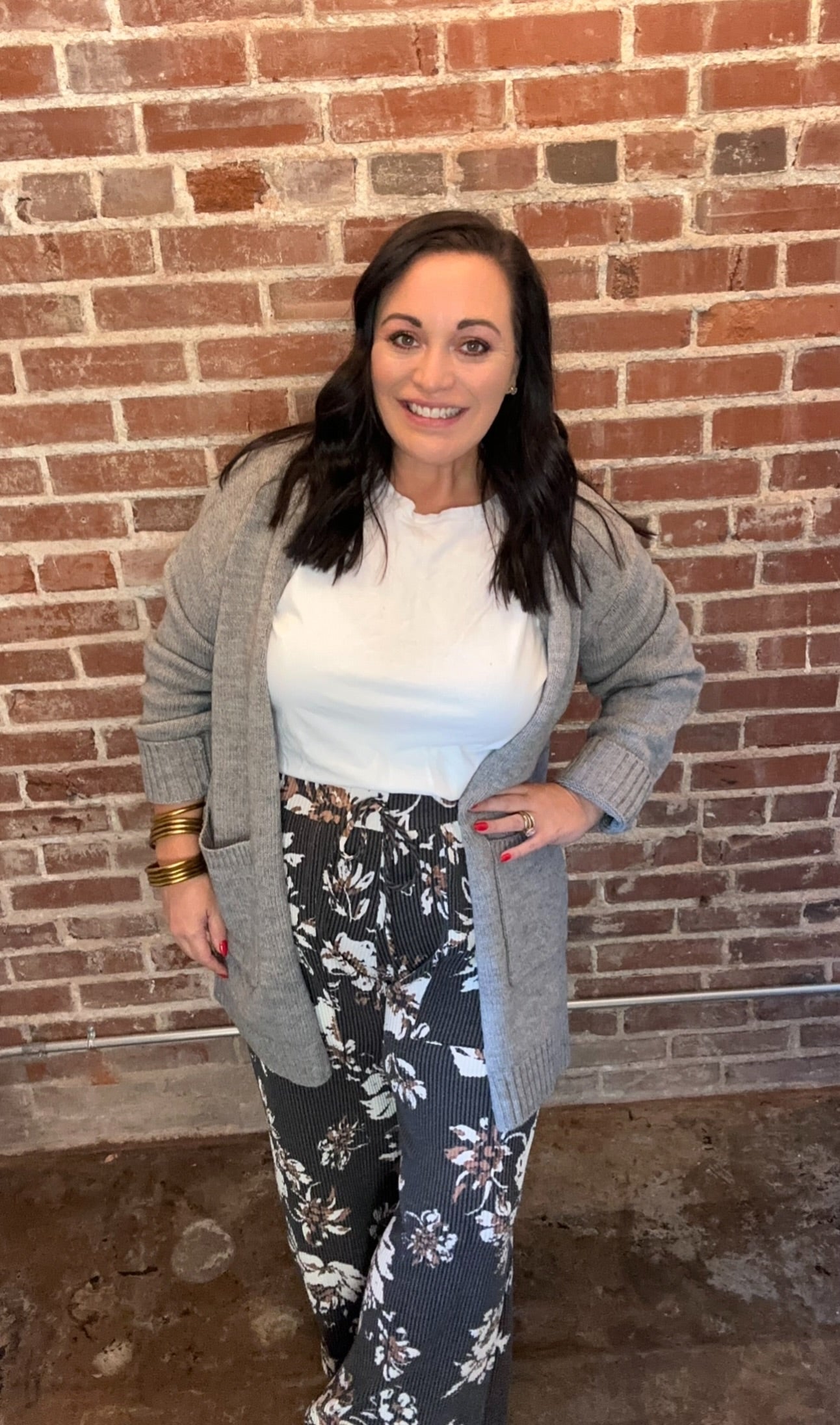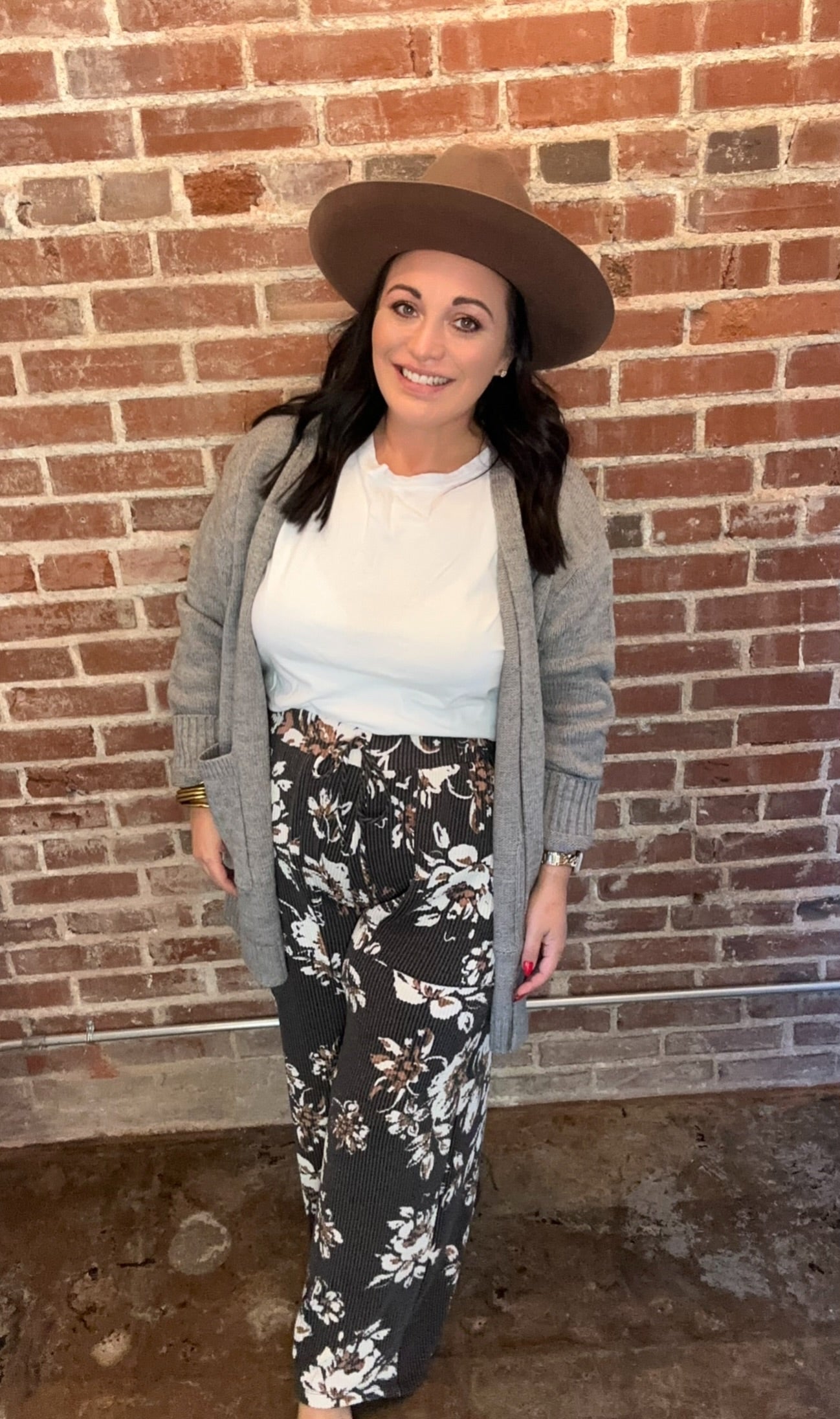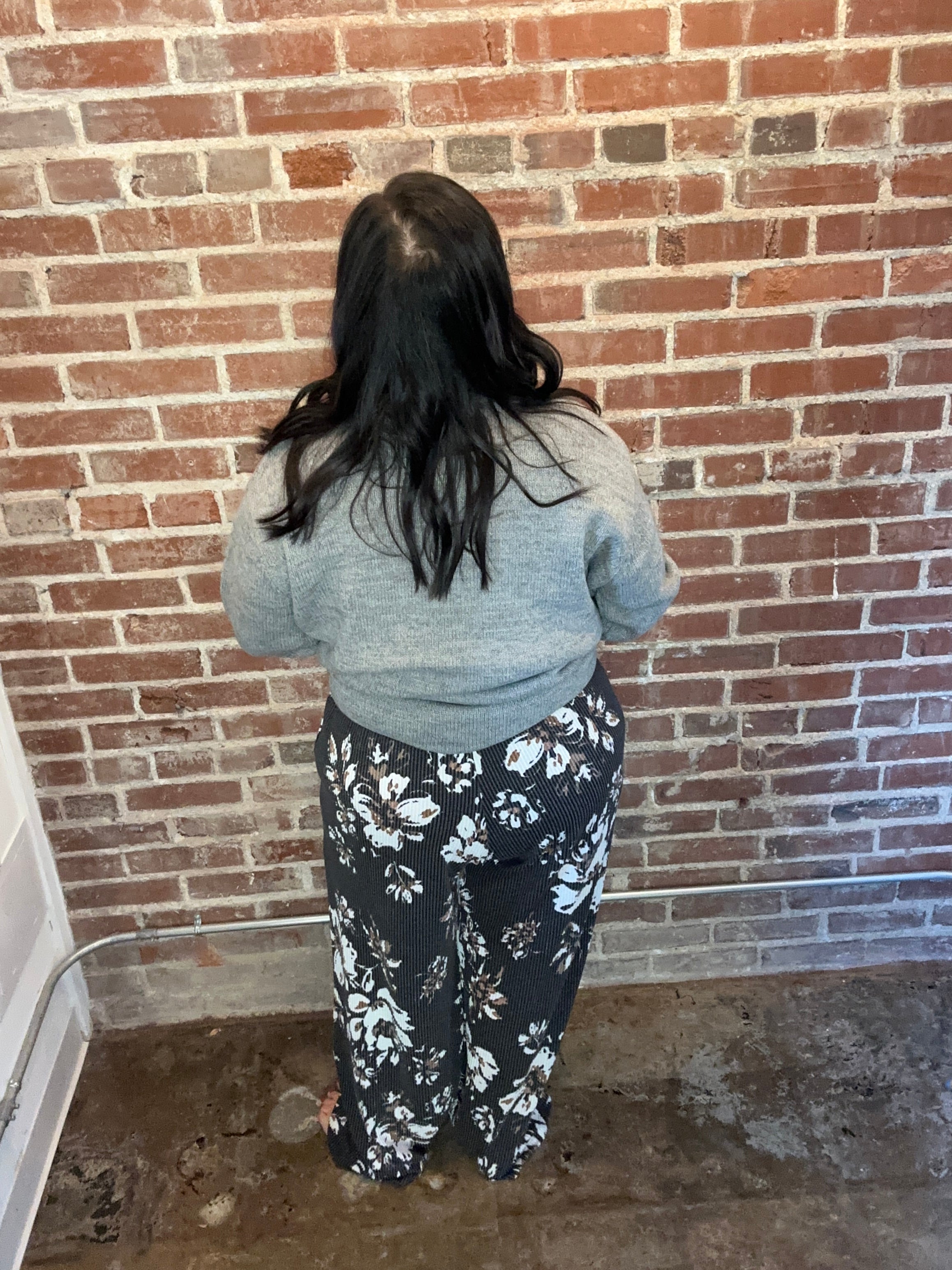 Soft, cozy and so so stretchy! These floral ribbed pants pants are the perfect way to add a "pop" to any outfit!! Features oversized panel pockets, wide legs and elastic waist with faux drawstring.
