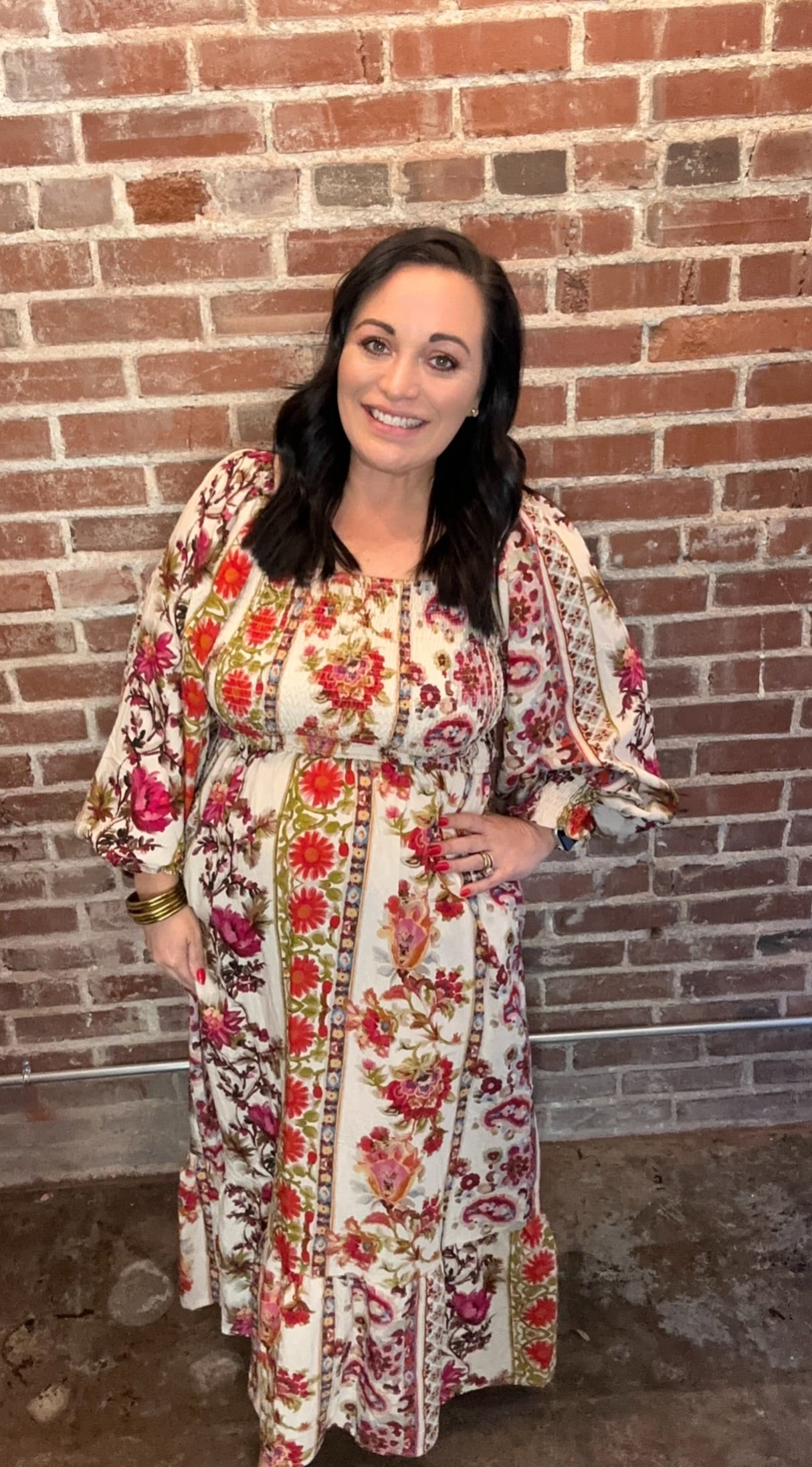 Add some boho vibes to your wardrobe with our floral printed maxi dress. The gathered sleeves and ruffle trim add a touch of whimsy, while the flowy silhouette ensures all-day comfort. Perfect for a carefree and stylish look