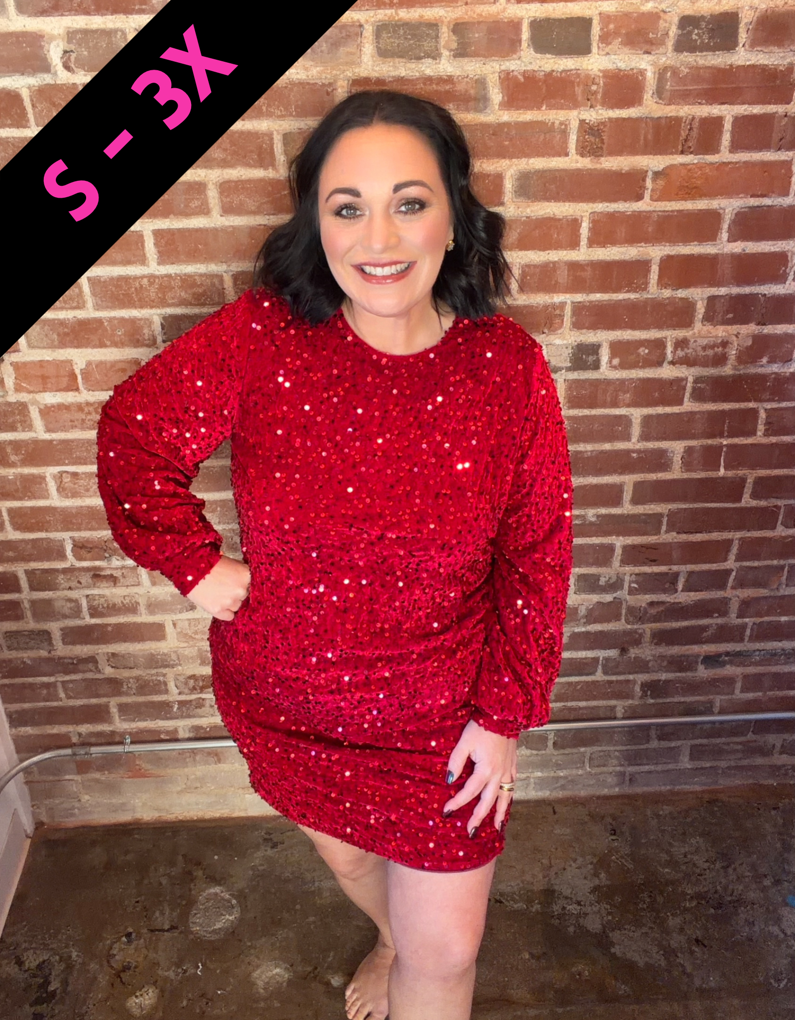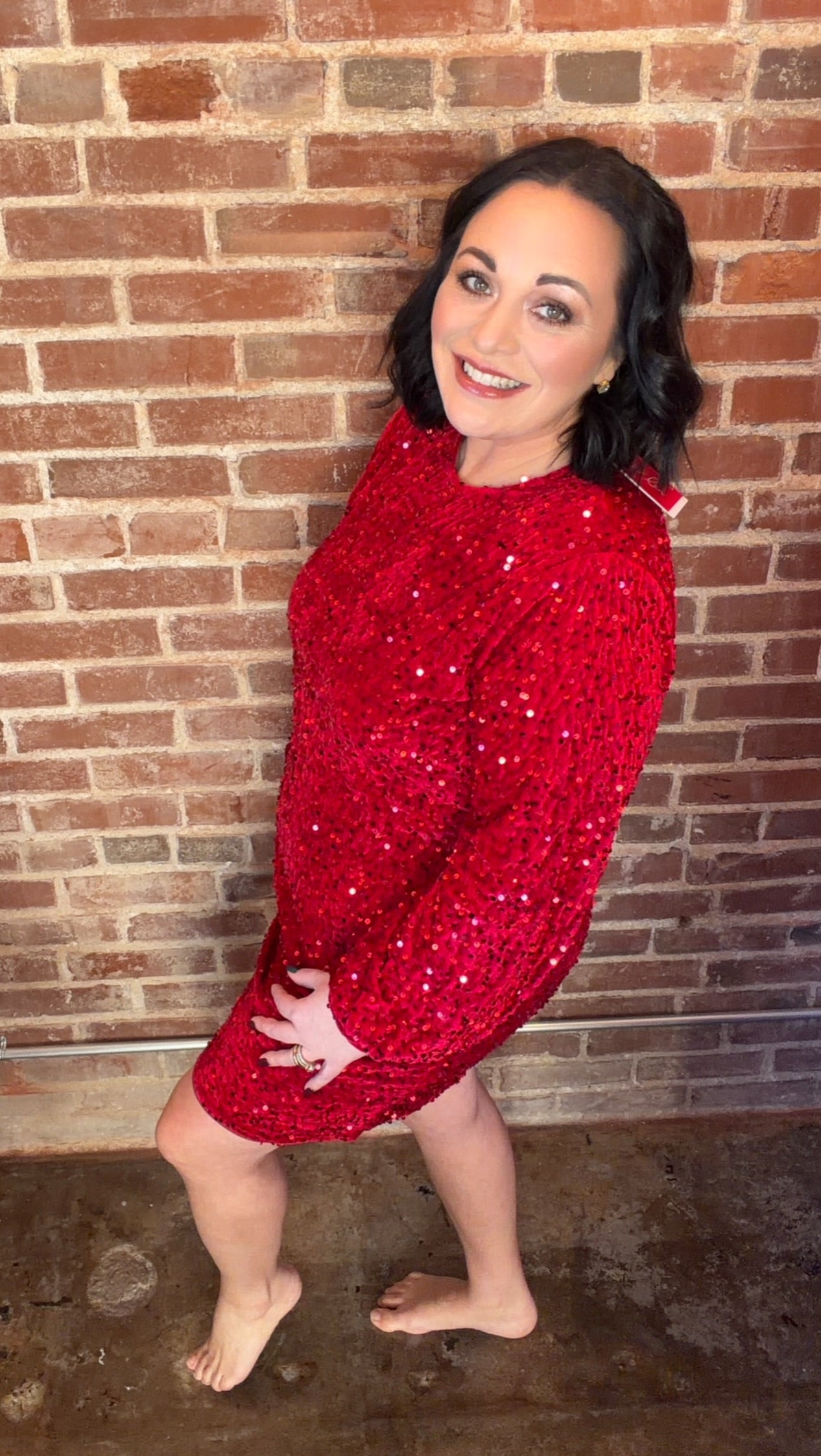 This fun sequin dress is just what you are needing in your closet for the holidays. It features long balloon sleeves, with super sparkly sequins and a velvet fabric! Perfect for the holidays parties and get togethers! You will not be disappointed in this gorgeous dress!